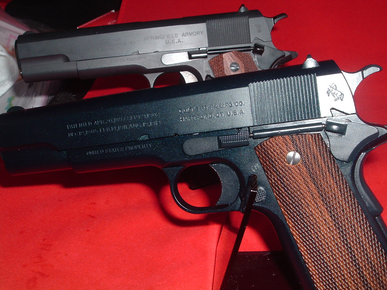 最初は40発近く有った筈なのに、今や十数発まで… いや、片付けられた部屋で撃てば良い、っちゅうハナシなんですけどネ。 《SUNDAY GUN-SMITH》 『. 45 AUTO MANIAC』 はいはい。 また「45口径自動拳銃」でっせ。 最近の「ガバメント・ヴァリエーション系」のクローンやタクティカル45にはもう付いていけないっちゅうか、複雑すぎてよく判んないよ。 だんだん「懐古主義」に偏るのも仕方がないというものだ。 なんつて 「WA社製ガスGUN『COLT M1911』」でございます。 1985年にベレッタにその座を譲るまでの実に半世紀以上の間、軍事大国アメリカの制式拳銃として活躍した「M1911A1」の前身として1911年に米軍に採用された大型自動拳銃というのは、ここの読者様一同には既にご説明するまでもありますまい。 おさらいとして『M1911』の『M1911A1』との大きな外見上の相違は ・トリガーガード後方の切りかけが無い ・トリガー・シュー(引金)が長い ・メインスプリングハウジングが直線 等々(厳密に挙げると刻印など他にも多数) このWA『M1911』、高価なモデルガンと違って常に手元に置いての「手慰み銃」にしようと思って中古購入したのだが、表面がブルーイング(塗装仕上げ?)されていたりしてガスGUNとしてもなかなか侮れない。 最近は「ビンテージ仕様」のWA製品も多いので、次はそのタイプが欲しいね(底無き欲望の塊)。 そこで以前にも紹介した「六研/リアルマッコイ社ロックライト製モデルガン『SPRINGFIELD ARMORY U.S.M1911』」と記念撮影。 今回の『M1911』は「COLT社モデル」ということで、スライド左後部の「ランパンコルト(跳ね馬マーク)」が誇らしい。 グリップは『SPRINGFIELD ARMORY』の方が断然良いね。 WAのは何故こんなにダサいのが付いているんだろう。 中古で入手したので、前持ち主の趣味かしら? ここは木製の「ダイヤチェッカーグリップ」を奢りたいところ。 PR 【9月06日の「今日までの半世紀近く、あのシャンソンで有名な巴里の「大通り」を『シャンセリゼ』だと信じ込んでいたのだが、実は『シャンゼリゼ』だったことを知り驚愕したことがばれて家族に哂われました」日記】 オ~、シャンセリゼェェ~~♪ オぉ~、シャンセリゼェェ~~♪ (勘違いver.でお送りしております。 土曜日「研修」で出勤。 帰路にふと「古書店」に寄ると割引セールをしていたので乱買してしまふ。 ☆新刊ハンター ・『進撃の巨人⑪』 諌山 創 あれ? 読んで全然ハナシが通んないぞ? と思ってたら第十巻を買っても読んでいませんでした。 チャンチャン♪ ・『ひるがお②』 艶々 Hなゲス物語(作者談)。といえば身も蓋も無いw ・『月刊モデルグラフィックス10月号』 まぁた特集が「ガルパン」かyo! チッ ・『月刊映画秘宝10月号』 表紙が「キックアス2」の『クロエ(グレース)モレッツ』! ヒャッホホーイ♪ ★100円ハンター ・『ピースメーカー⑧』 皆川亮二 ・『吉祥寺キャットウォーク①』 いしかわじゅん 豆知識:「キャットウォーク (catwalk)」 劇場や工場施設の上部、ダムや橋梁などの高所や大型貨物機、潜水艦、飛行船などに設置される狭い通路。 日本語では『犬走り』(←ココ笑ふトコロ) ・『オーサム・フェローズ』 漫画雑誌「フェローズ」に描いている24名の漫画家のテーマ毎のアンソロジー短編集。 睦月のぞみ、森薫、入江亜季、冨明仁、福島聡 等々 ・西遊奇伝『大猿王Vol.1』 寺田克也 ☆300円ハンター ・『就職難!!ゾンビ取りガール①』 福光しげゆき 意外や意外。遺骸や以外。 面白かった♪ ・『大砲とスタンプ②』 速水螺旋人 ・『中春こまわり君Ⅱ』 山上たつひこ 今や「山止たつひこ」っちゅうても知ってる若い奴は…… ・『花びら蕩ろり』 鶴田文学 ・『天使の課外授業』 笑花偽 ・『10年分犯す』 板場広し ・『Gun Magazine 2012,12. 2013,8』