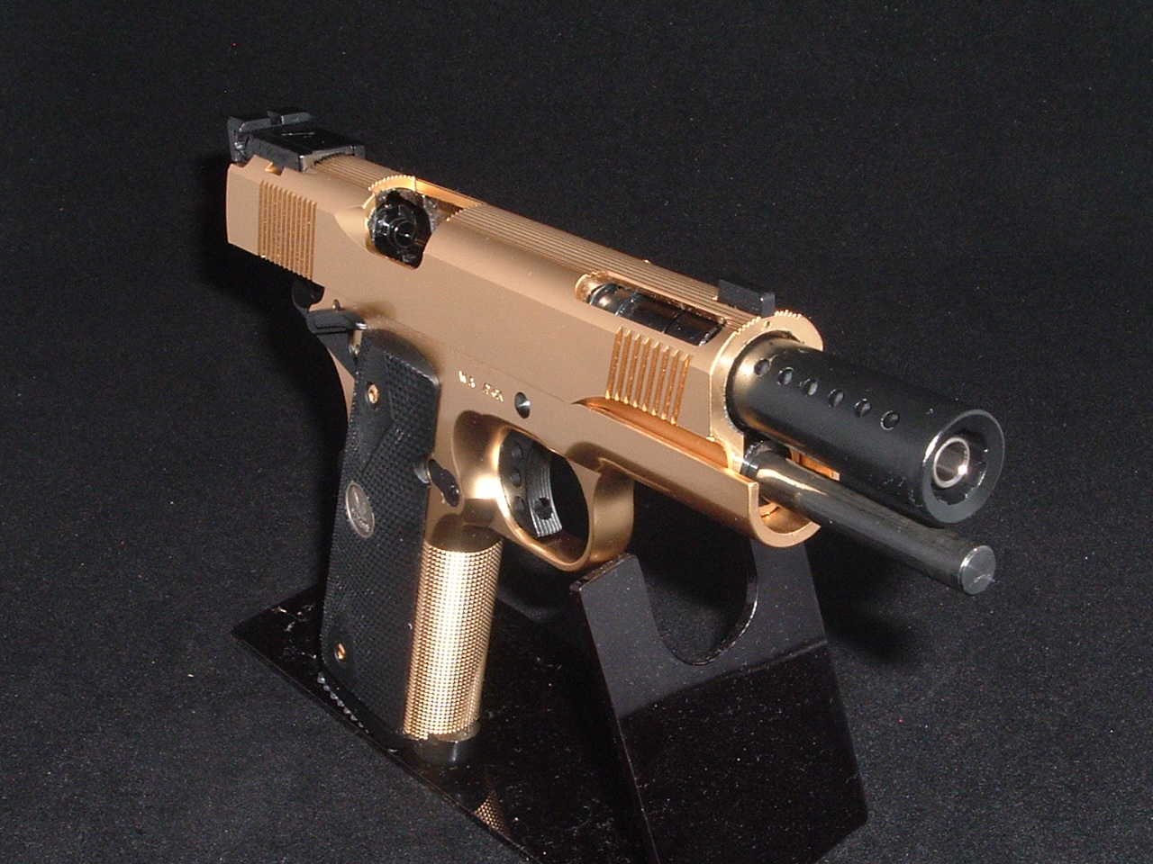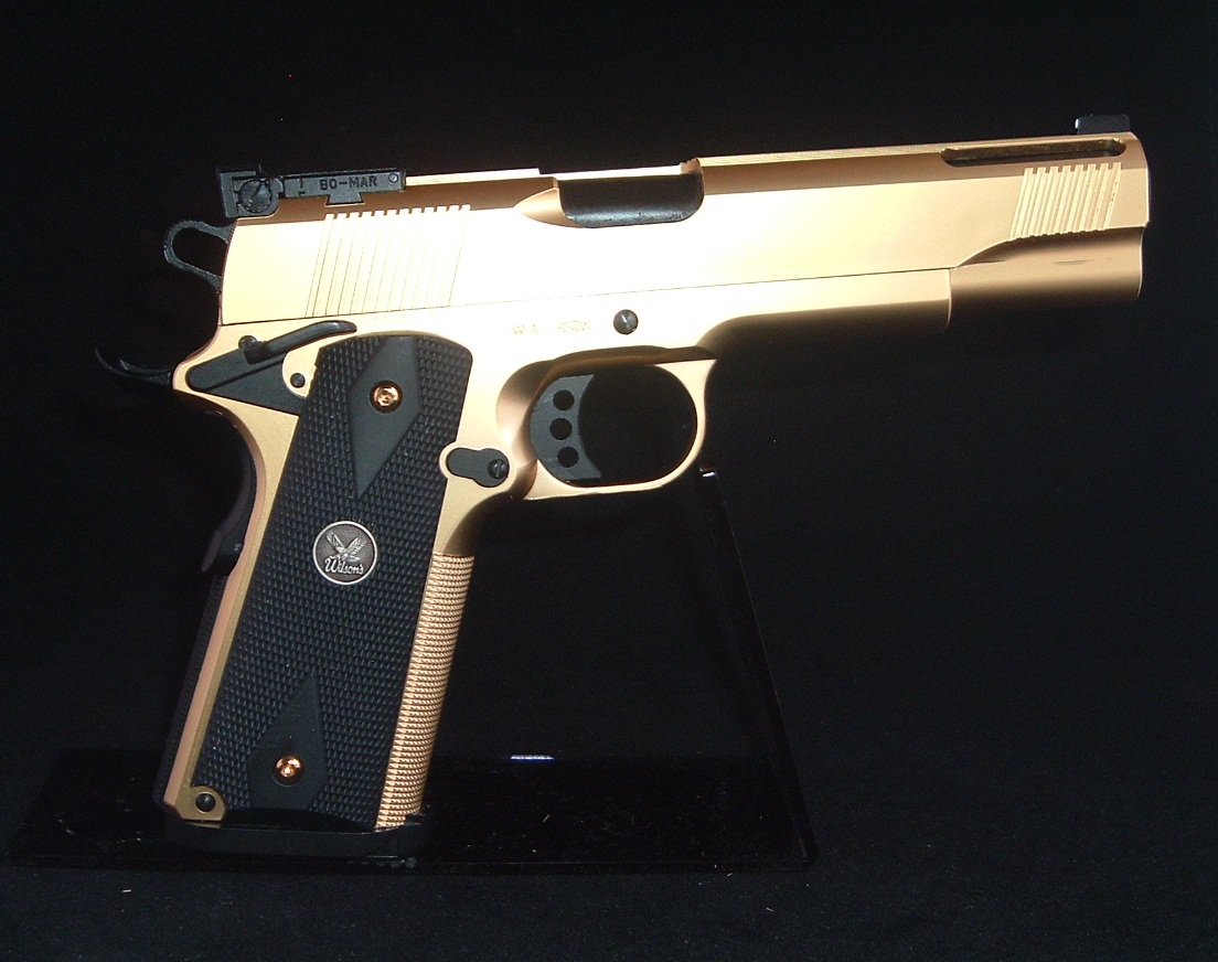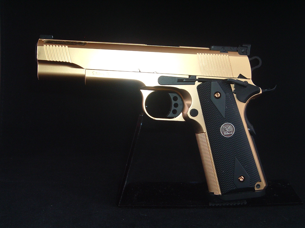 【5月06日の「.45 AUTO MANIAC」日記】 でも「金色ガバメント」は以前の「SCW M1911A1 GOLD」を持っているので、これで二挺拳銃の『フェイスオフごっこ』が出来るぞ♪ |