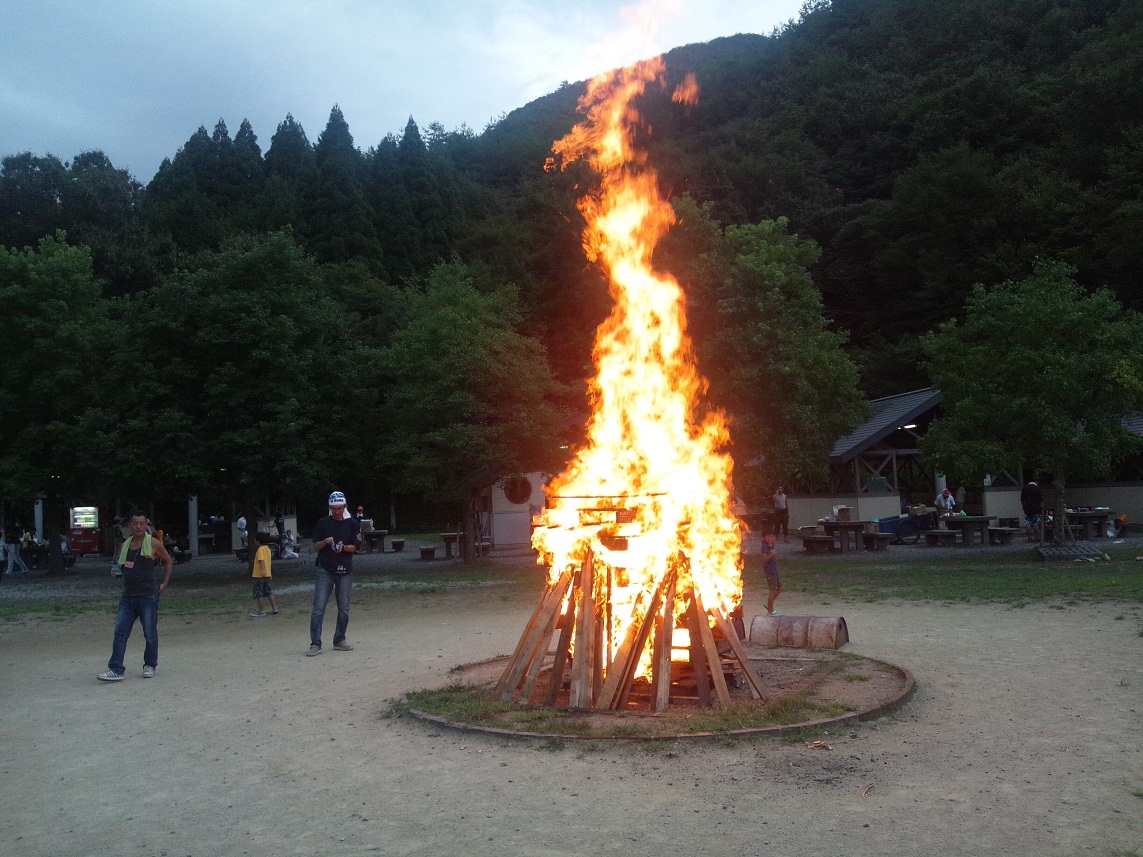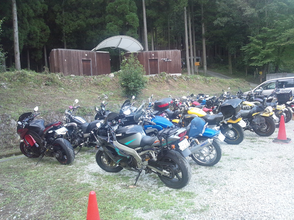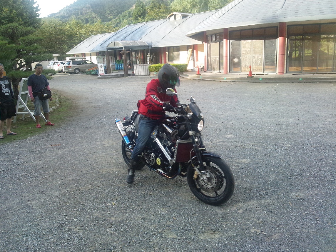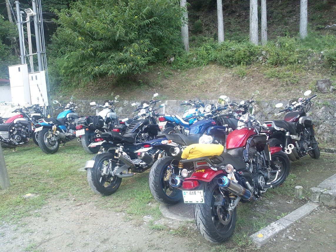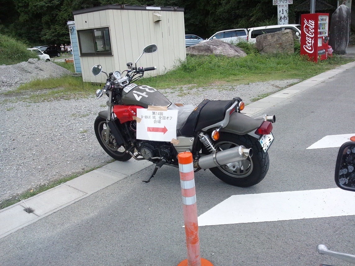 朝八時半、本社にて同僚「みやも」氏と待ち合わせ。 今日はお休みだというのに、彼は今から「現場打ち合わせ」なんだって。 エラいなぁ。見習わなくっちゃ。 ついでに火曜日からの出張納品用に、彼の営業バン車を貸してもらう。 その後、散髪とお薬を貰うための通院を済ませ帰宅。 正午までまだ時間が有ったので、愛車V-Maxを洗車。 今日はお昼から兵庫県三田市で開催される『第14回 VMAX ML全国オフ』に参加するためだ。 午後二時、自宅を出発。 午後四時頃「受付開始」と聞いているし、営業テリトリーでもある「三田市」だから道順に戸惑うことも無かろうて。 阪奈道路からずっと下道のルートを選択する。 生駒山を駈け下ると行先方向の空が真っ暗だ。やヴぁい予感。 その予感が大当たり。 外環「門真」辺りで雨が降り出す。 雨合羽は持参していたのだけど、「合羽着ようかな。単車停めるの面倒臭いな。夕立だし、すぐ止まねぇかなぁ」などと考えてるうちに本降りになってきてズブ濡れ。 しかし「宝塚」近くになると雨は止んで陽も差し始める。 こりゃ走っているうちに乾くやろ。 三田市内から37号線を北上すれば自然と会場の「三田市野外活動センター」に到着するはず。 「楽勝やん♪」と思った途端、何故か323号線に迷い込む。 ふふふ。そんなことも有ろうかと、密かに用意しておいたスマートフォンの『地図アプリ』が役に立つ時が来たようだなby.真田さん。 え? 自分の居る地点の「矢印」ってどの方向? っちゅうか今、自分の単車が「東西南北」どっちゃを向いているのか判んねぇじゃん。 お役に立ちません(利用者側的問題)。 誰や誰や? こんなトコに壊れて廃車になった古いV‐Maxをホカしてる不届者は?と思ったら、幹事の「48」さんの愛車が道路脇に停めてありました。 シートに「第14回 VMAX ML全国オフ会場 こっち→」との貼り紙をして。 会場到着。 見覚えのあるスタッフの方が駐車場に先導してくれる。 40台以上は先に来てはるのね。 受付を済ませて参加記念品の「参加記念特製タオル」を貰い、同時に『V-max ML FILE Vol.2』とチャリティーも兼ねた『第13回全国オフ山梨記念ピンバッチ』も購入。 今晩宿泊するバンガローに荷物を放り込んで、会場のキャンプ場へ。 主催者の48さん達に御挨拶。 「腹減ったぁ…」(どんな挨拶か?) 「タコ焼き、もう売り切れたよ」 がびょーん! 楽しみにしてたのになぁ…。そもそも来るのが遅いんだけど。 しかし会場には今宵のメインディナー『豚の丸焼き』が生前そのままの御姿で鎮座されておられる。 渇いた喉にサーバー生ビールを流し込み、まだ陽も暮れないという時点で中央のキャンプファイヤに火が放たれ「大宴会」開始。 顔見知りの方々と挨拶と会話を交わしつつ呑む呑む。 山陰ライダー「ですらぁ氏(双子パパ)」ともお久しぶり。 「わし、こないだ『総火演』観に行ったで」と自慢する。 熱い漢たちと語り合い、豚を喰い杯を重ねるうちに私が一番にツブレてテーブル上で大の字になって寝てしまいました。 一番肝心な大事な時間にオチちゃったワケやね♪ テヘペロ (続く)