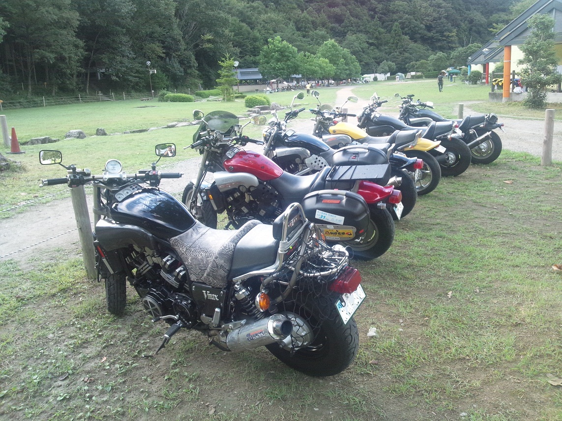 尿意に眼が覚める。 気が付けば、そこは白い病室…ぢゃなくって兵庫県「三田市野外活動センター」内宿泊バンガローであった。 昨夜の最後の記憶は『第14回 VMAX ML全国オフ会』幹事の「48」さんに会場キャンプ場で酔っ払った挙句テーブルの上で大の字になって寝てしまった処 「大丈夫ですか? もうバンガローでお休みになられた方が…」と起こされた瞬間で、またブッツリ途絶えた。 どうやらそこから一人でバンガローに転がり込んで、ちゃんと布団を引いたうえでまた寝入ってしまったらしい。 バンガロー・バンザイ!(←ここは「バッカルーバンザイ」にかけた駄洒落である) 夜明け前朝方は流石に冷える。 昨夜の主食が腰が抜けるほどの大量のビールだったので、吃驚するぐらい長々と時間を掛けて排泄を終えた。 再び寝床に戻り、しばらく悶々と寝返りを繰り返す。 やがて夜が明け、元気な子供たちの歓声嬌声が聞こえ始めた。 少しふらつきながら洗面所で顔を洗い、昨夜のパーティー会場だったキャンプ場に向かう。 ありゃ? 向こうから歩いてくるのは伝説のV-Maxセッティング魔人「とーち」さんやおまへんか。 「あれ? 昨日居てはった?」といきなりの御挨拶。 「昨夜遅く到着したら、もうMARUさん死んではりましたで」 …そうでっか。 とーちさん、恒例の「朝練」で走りに行く。 その後会う人合う人知ってる人知らん人に「大丈夫でしたか?」「昨夜はよく寝てはりましたな」「調理の邪魔でした」などと次々と暖かいお声を頂戴する。 恥ずかし♪ 朝食代わりの「わかめスープ」、とても身に染みて美味しゅう御座いました。 しめしめ。一番旨そうな愛知県産「焼酎梅酒」の一升瓶を遠慮なく頂くことに。 また「V-Maxラベル」の貼られた酒もあって驚く。 その後、参加者全員で記念撮影を行い、『第14回 VMAX ML全国オフ』は終会。 とても楽しゅう御座いました。 スタッフ幹事連の皆様、また会場で遊んでいただけた心優しき漢どもと素敵な御姐さん方々様江、 誠にありがとさんでした。 また何時か、何処かの路上でお会いしましょう。 あとで「あのオッサン、ただ寝に来たんちゃうんけ。ペッ!」と陰口を叩かないよーに。 で、帰路にまた「ゴリラ鯨雨」に降られて再度ズブ濡れになりました。懲りない男子です。