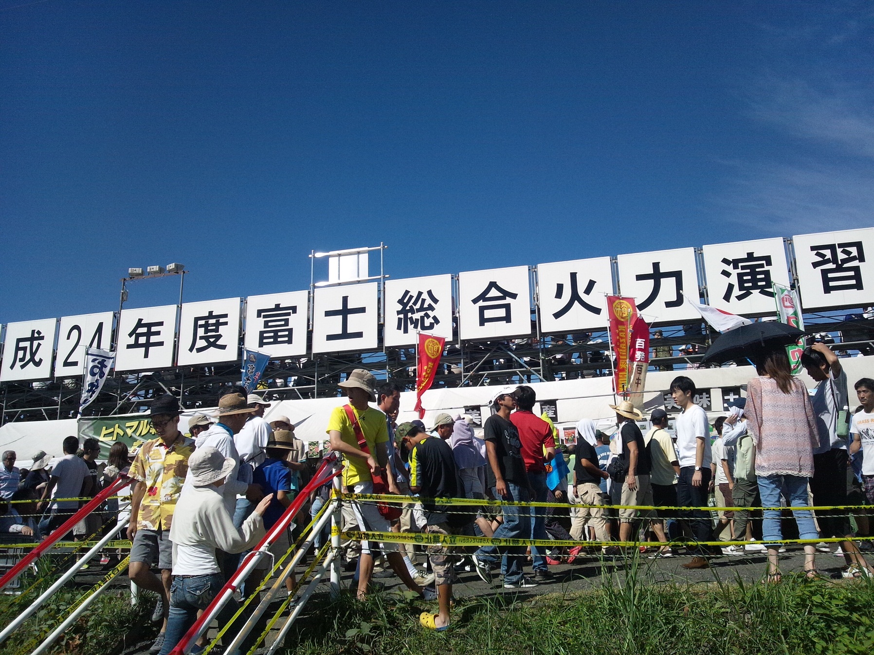 午前七時前に『平成24年度富士総合火力演習』入場が始まる。 その寸前、長い列に並ぶ我々の前にスッと年配女性四人組が横入り。 をやぢ殿が激怒して「ババァ氏ね!」と大声で罵り続けるのを見てゲラゲラ笑ふ。 入場ハガキやチケットにより客席の種類が異なる。 我々のは後ろの雛壇席ではなくて最前列の「砂被りシート席」。「こっちの方が近くで観れるもんねぇー!」と負け惜しみを言う。 自衛官案内係の号令と共に、横一列となった集団がロープで指示されたシート席まで軍隊の様に行進して着席。 私たちは幸運にも前から五番目の一番端の席。 出入りが楽なんだよね。 でもその代り、席中央の観客が出入りする際、一々身体を避けて通してあげないといけないんだけど。 目の前の演習会場には既に数台の「戦車」が並んでいた。 その方面にあまり詳しくない私達にも「90式戦車」と「10式戦車」位は見分けがつく。 腰を下ろしつつ「なんかアレだねぇ。海洋堂のWTM(戦車の小さなフィギュア)みたいで、変にリアル感が無いねぇ…」と言った瞬間 ドガン!! と一発、戦車主砲をいきなりブッ放しやがった。 いや、驚いたのなんの。心構えがまるでない状態だったので、「衝撃波」で身体が数センチは浮いた(本当)。 「だ、誰が撃てと言ったかぁーーっ!!」 すると続けて各戦車が一斉発射しだした。 開演の午前十時に先駆けて「サービス」のつもりか、午前七時の「予行演習」であった。 しかし「戦車砲」発射時の轟音の凄まじさと「衝撃波」の大きさには腰が抜けるほど吃驚した。 こればっかりはこのようなリアルな現場でしか体験し得まい。 どんなに「映画館」などの音響システムが進歩しても再現できるとは思えないクラスである。 その後「戦車部隊」は撤退して「99式自走榴弾砲」や「87式偵察警戒車」などが「試射」を繰り返す。 正式開演を前に既に「お腹一杯」状態となる。 「予行演習」も終了し、午前八時から十時まで「自衛隊音楽隊」の生演奏やら「防衛大臣」等エラいさんの入場やら。 エラいさんは真っ黒なトヨタ「クラウン」に乗車して来場。 「前段」は「遠~中~近距離火力演習」となり、各々「榴弾砲」「迫撃砲」「個人装備火力」「戦車」などが実弾発射。 最後は「空挺部隊」による上空ヘリコプターからのパラシュート下降で一旦終了。 でもやっぱ、地上戦の「華」は『戦車』だよねぇ。 どんなに繰り返しても「発射時」にはオシッコちびりそうになっちゃう。 「後段」は我が国に侵攻してきた想定敵国軍を迎え撃つ「陸海空自衛隊」の総合演習となる。 ヘリボンからの偵察用オートバイ部隊のジャンプも観れて興奮。 最後は「全装備」参加車両総登場での「戦果拡張」シーン。お馴染みのナイアガラのような「煙幕弾」発射の外連味ある有名な場面で幕を閉じる。 いやぁ、述べたいことは其々にたくさんあるけど それはまた別の機会に。 「をやぢ一家」さま、御世話になりました。さんくす。 ご精読、ありがとうござんす。