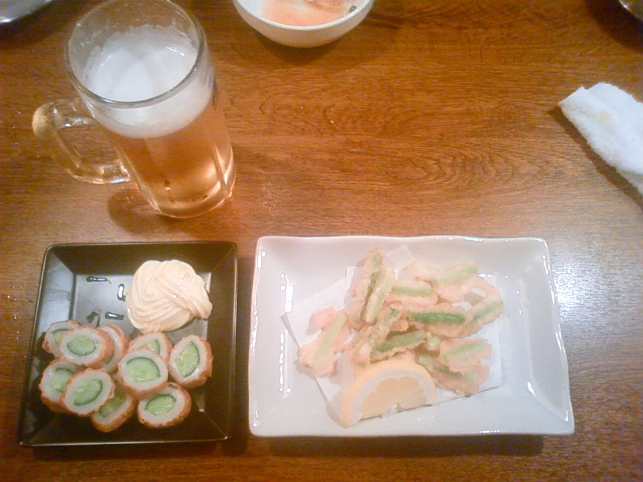 徳島から香川を経て高知県入り。 いや、やっぱ暑いわ。 南国市と高知市内をはいずりまわって夕刻、定宿ホテルにチェックイン。 部屋で水シャワーを浴びて後、夕食を摂りに街に繰り出す。 宿痾の業病「tufu」のリハビリの為に(?)、土佐の居酒屋「赤たぬき」へ。 リハビリなので本当は食べたい「肉類(焼鳥、串カツ等)」は避けて、急遽「怪奇ベジタリアン男」に転進変貌変身する。 仕事の道中、ずっと「キュウリが食べたい!夏はキュウリじゃっ!!」って考えていたので、『チクQ(チクワの穴の中に胡瓜が差しこまれている)』と『アスパラガスのビール揚』。 『ビール揚』ってナニ?って思ってたんだけど、結局聞き損っちゃいました。 どちらも美味しかったっすよ。 画像左上に見える黄色の液体は「生ビ…あわわ、これは、そう、アレでつね。高知名物『生ポンカンジュース』! 酸っぱくて健康にすっごくイイのよ、これわ! もう南国の夏場はコレに限るよネ♪ プッハァーー! いや、 信じようが信じまいが、それは貴方の判断にお任せいたしましょう(ナニヲエラソーニ)。