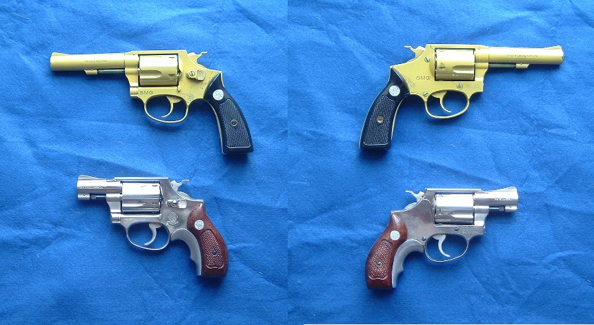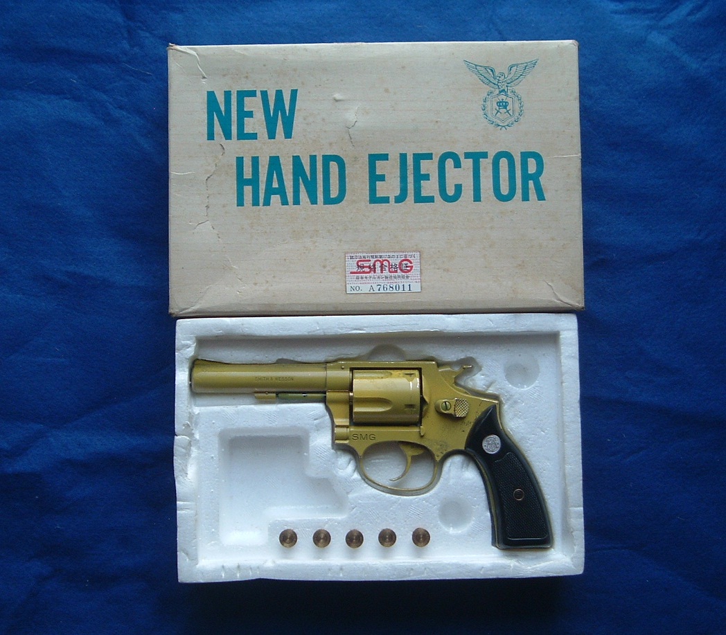 そして「ハンドエジェクター」の本来の意味は、S&W社のスイングアウト式リボルバー全般を指した呼び名。 モデルガン黎明期に業界老舗「MGC」がチーフの長銃身を『ハンドエジェクター』と呼んで製品化したために、 その名はその後長らく親しまれてきた。 記念撮影は同コクサイ社の金属製モデルガン『M36』とパチリ♪