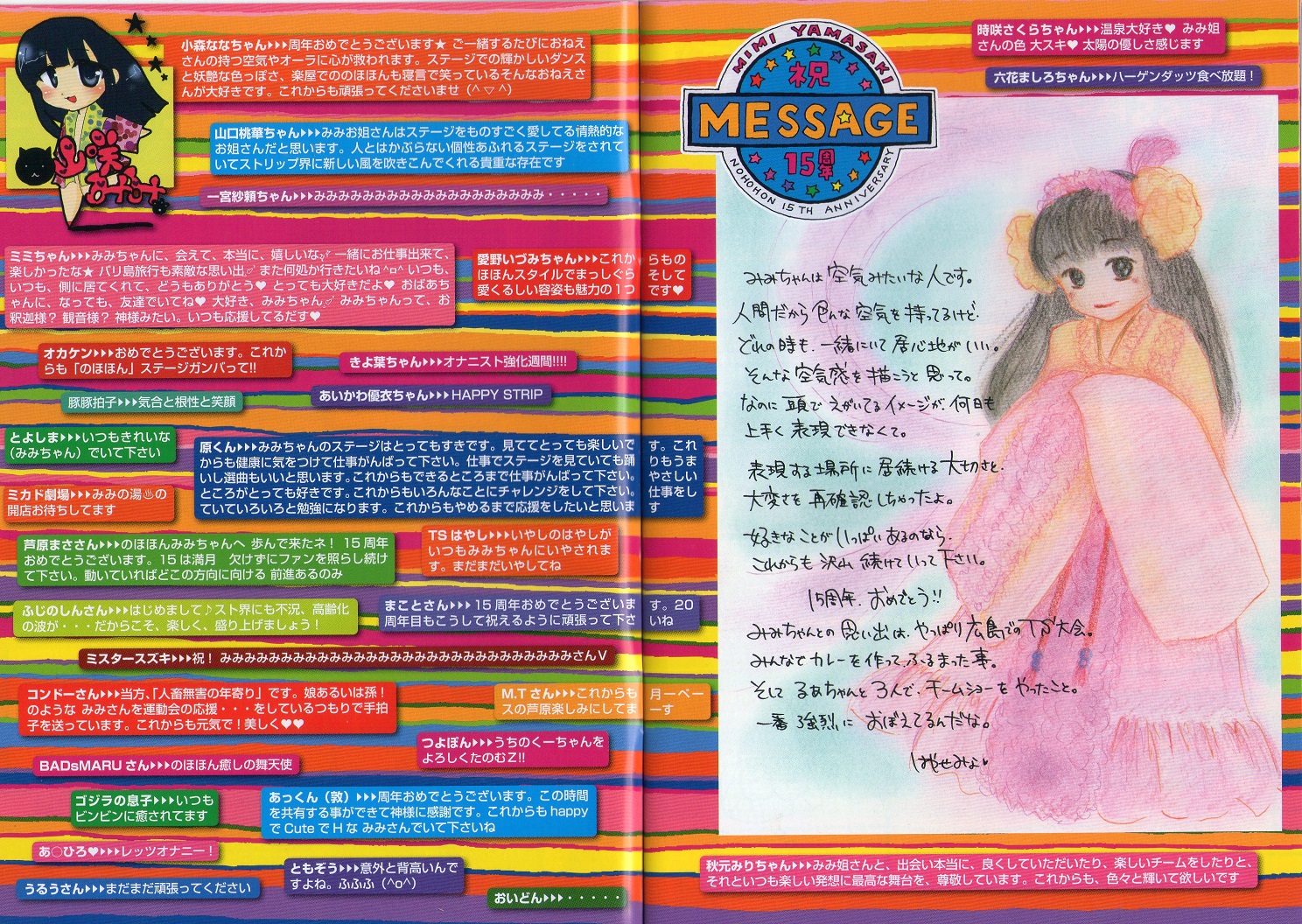 さて、今回は愛しの舞姫「山咲みみ」嬢が配布されておられる個人誌『のほほん通信』のことに触れたい。 彼女が例えば「デビュー●周年記念」の記念(?)として折々に発行されている。 私は残念ながら「第三号」「第四号」しか持っていないが、この度「(デビュー)十五周年記念号」を彼女から直接頂くことが出来た。 まさに重畳である。 21日の晩の深夜、超強行軍で高速をブッ飛ばし帰宅後に楽しみながら読破した。 プロの流通雑誌そこのけの出来とセンスに感心する。 特に欄外の1999年~2014年前半までの彼女の香盤劇場リストが有難い。 「あ、この時に初めてお会いした!」とか「この劇場で観に寄せて頂いた」とかファンにとって重宝することこの上ないであろう。 後半、同業の姐さんや劇場関係者、そして熱心なファンによる六頁見開きに渡る「(みみさんに贈る)祝十五周年記念おめでとうコメント」という企画があった。 何も期待せず読み進めていると、腰が抜けるほど驚いた。 我が醜名…あわわ、HNである「BADsMARU」が掲載されているでわないか! 内容は某SNSで彼女に送った「メッセージ」より。 非常に取るに足りない内容にもかかわらず、こんな記念となる印刷物に掲載していただけるなんて…! 感動と感謝で胸を熱くしてしまいました。