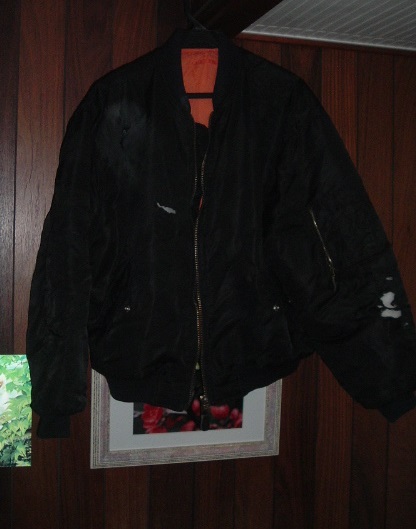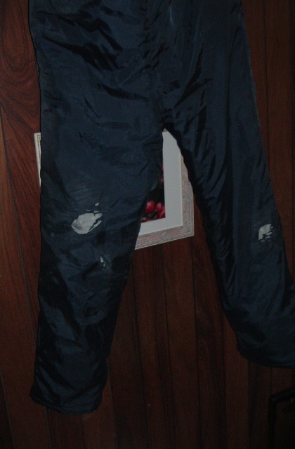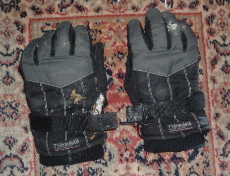 よ、幼稚園児かぁっ!? 現代の五十歳代男性平均が46㎏前後。 わしゃ過去に右手で60㎏マークしたことすらあったのになぁ… 皆様ご存知の通り、わたくし単車(愛車:V-max)で事故っちゃいました。 自爆自損単独という他人様へのエコ御迷惑事故。 意識不明で救急病院へ搬送されたものの骨折無し、擦過傷少々という超ラッキー超余裕(←しんでも流行語になってほしくないね)な状況で二泊三日で退院。 いまは自宅療養中、時々通院という「全治三週間?」な御身分で御座います。 通院から帰宅してみますと、玄関に見慣れぬ大きなビニール袋が。 これは何かと家人に問えば、私が事故当時着用していた着衣上下だといふ。 夕刻の会社よりの帰宅時の事故だったので作業着の上からMA-1タイプのフライトジャケット、下には屋外作業用の防寒厚手オーバーパンツをズボンの上に履いていた。 先ずは「単車用グローブ(手袋)」。 ホームセンターで購入した安物ゴアテックス。 でも冬場は革製手袋より遥かに暖かいんだけど。 ボロボロですね。 特に手の平部が裂けている。 これは地面に接触した時の破れだろうな。 私の左手甲の部分に擦過傷が残る。 右手は二の腕外側に少し。 今回の事故で両掌に一番「麻痺」等のダメージが残ったが、これは外傷というよりも事故の衝撃からの神経的な症状だとの説明を医者から受けた。 この安物のゴアテックス手袋も、それなりに私の身体を守ってくれたワケである。 上着の「MA‐1フライトジャケット・レプリカ」も無残。 これは広島の某総合中古店で二年前に購入。 3000円くらいだったけど「新古品」に近かったし、生地や中の綿(?)も厚手だった。 右胸部が裂けているが特に酷いのは左腕部。 肩から手首まで擦過の時の摩擦で表面生地が溶けてしまっている。 この手の衣料は気軽に着れて快適だけど、単車海苔はやっぱ「革ジャン」が吉ぢゃん? 冬場に欠かせない「防寒オーバーパンツ」。 やはりというか当然ながら両膝にダメージ。 両膝の大きな怪我が無かったのは、まさに不幸中の幸いの一つ。 裏返すとお尻の部分も破れていた。 退院して家に帰り風呂に事故後初めて入った時、家人に指摘されて気が付いたのだけど左足太腿部内股に大きな内出血が出来ていた。 痛みはあまりないのだが、左足の太腿から膝まで少し「引き攣れ」を感じる。 次回は「ヘルメット編」、そして「小ネタ」ならぬ「日常小日記」を挟んで「車体編」と続く(予定)!