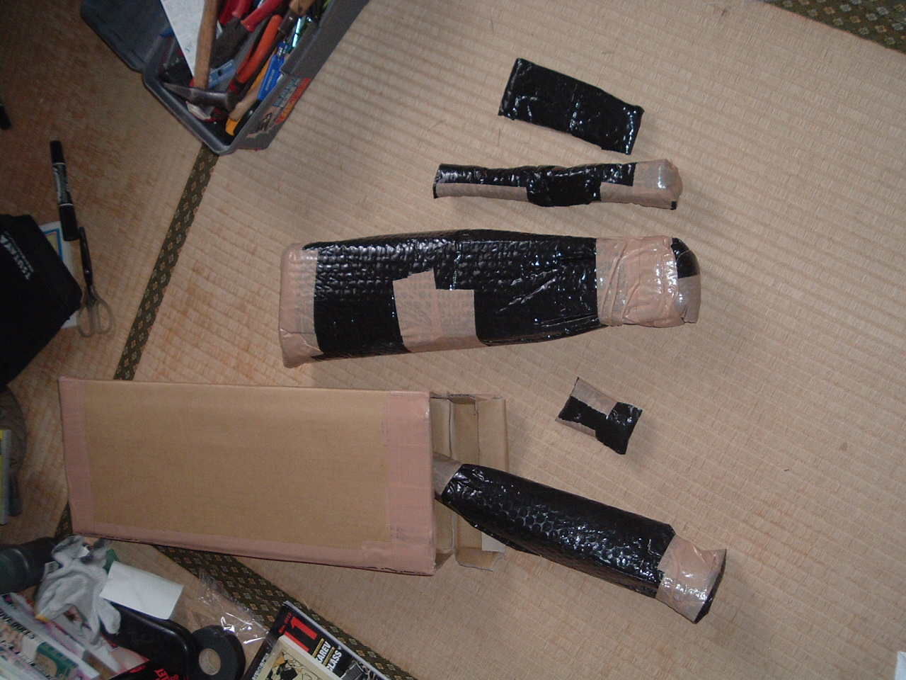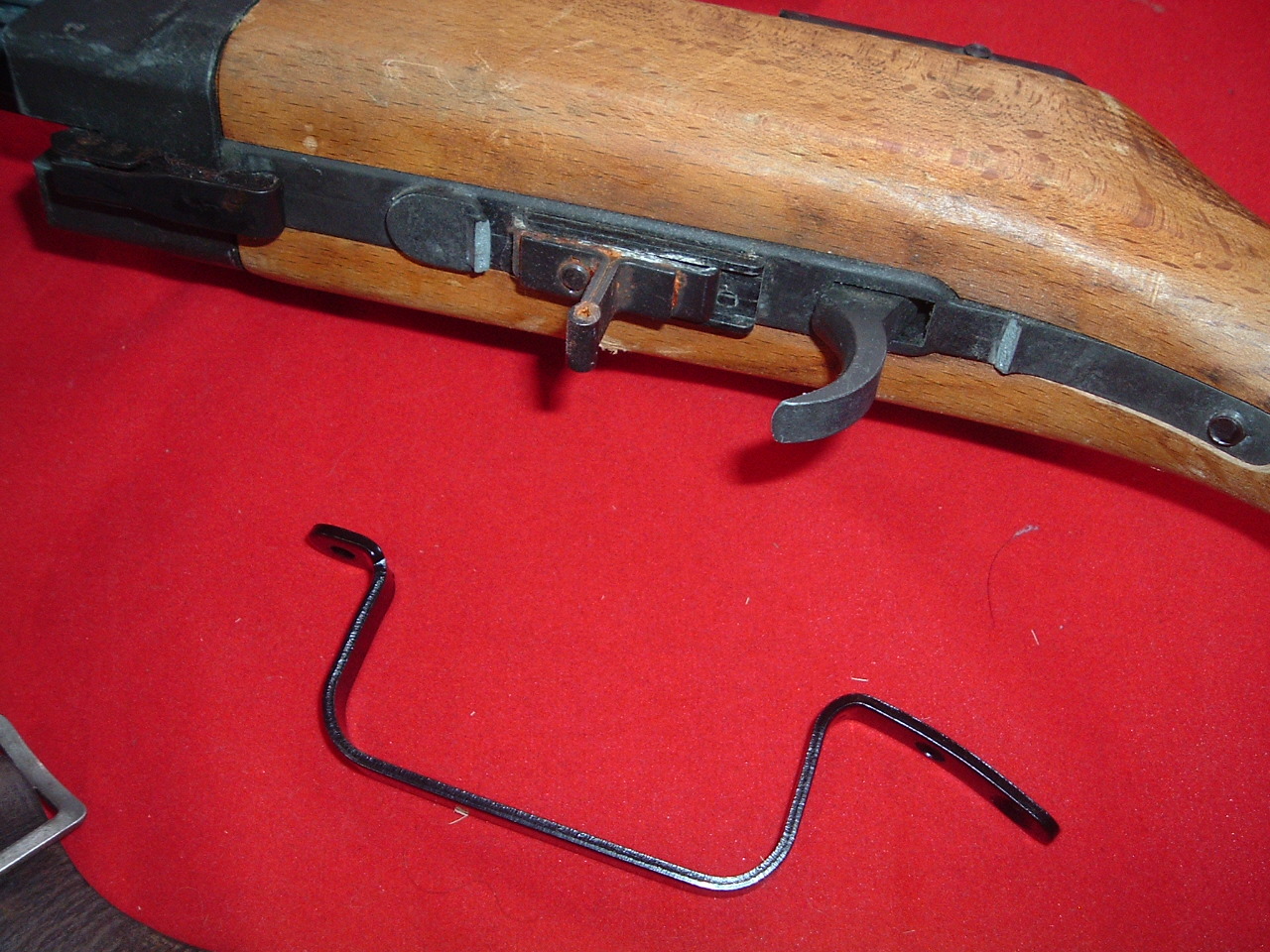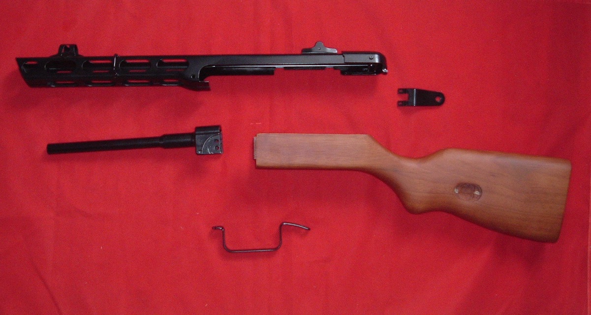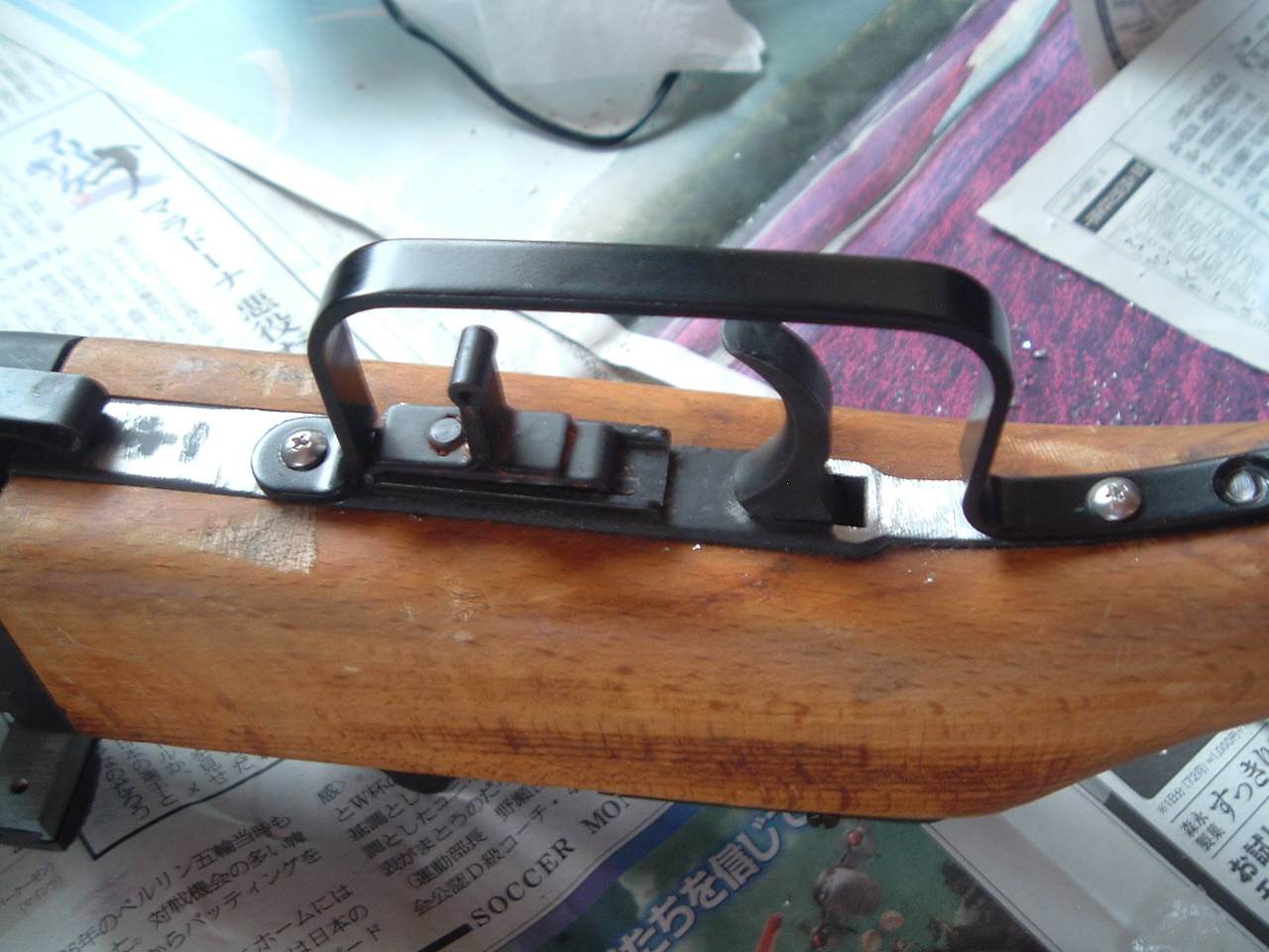 《SUNDAY GUN-SMITH》 荷物が届いた。 とあるドス黒い野望を胸に、某ヤフオクで落札した一品。 荷を解いた。 その内容物は一個一個丁寧に真っ黒いビニール袋で包装されている。 やっぱ「チャカ関係」はこーでなくっちゃネ♪ それは『S&T電動ガンPPSh41短機関銃パーツ一式』という代物。 ・バレルジャケット付レシーバー(リア・フロントサイト完備) ・アウターバレル ・トリガーガード ・木製ストック 御存知かどうかは知らないけれど、私の手元にはHUDSON社製モデルガン『PPSh41』短機関銃(割と希少品だよ)が二挺ある。 但し その内の一挺はリアサイトとトリガーガードが破損していて完全な状態とは言い難い(だから格安で入手出来たんだけど)。 その「部品調達用」としての今回の落札があったのだ。 先ずはHUDSON社製モデルガン『PPSh41』のリアサイトカバーを取り外す。 この部品はモデルガンと今回入手した電動ガンとも六角ボルトで止められてはいるが、互換性は有りそうだ。 果たして左程苦労せず、電動ガンのリアサイトはカバーごとモデルガンへの移植が成功する。 電動ガンパーツが新しく綺麗すぎて、ちょっと古参のモデルガン本体との色調に違和感は残るけれど、それがそれでラッキー♪の指サック。 お次は難関のトリガーガード移植。 モデルガンのトリガーガードは、なんと鋳物キャスト製で本体と一体化されていた。 そりゃポッキリ折れちゃうって。 新しく入手した電動GUNの同じ部品は、実物と(多分)同じ「スチール製プレス」で出来ている。 モデルガン本体に残っているトリガーガード基部の残りバリの撤去から作業を開始した。 前部の大きなバリは金鋸で切り落とし、後部の小さな突起と前部の修正は金ヤスリで行う。 作業が雑で木製ストックに少しキズが入っちゃったけど気にしない(フリをする)。 ある程度まっ平に整形出来たら、本体レシーバー部にトリガーガード取付け用のネジ穴を開ける。 これが家庭用インパクトドライバーにドリルを装着しての作業で一苦労。 こういう時はホビー用の卓上ボール盤でも有れば楽なんだろうけど、無いものねだりしてても仕方ないしね。 四苦八苦してどうやら「貫通」性…あわわ、成功。 トリガーガード取付け前に本体の剥がした部分の色を塗ろうと「亜鉛用ガンブルー(亜鉛金属部を黒く染められるお薬)」が確か一瓶分有った筈と探してみるも見当たらない。 これは後で黒スプレーで塗装するか黒マジックで誤魔化しちゃうとしようと、部品の取り付けを最優先に。 素人加工なので多少の誤差を生じたものの、困った時の「エポキシ樹脂系接着剤」との併用固定を試みた。 画像下側のHUDSON「Ppsh専用30連バナナマガジン」付の銃が今回「補修」作業を行った一挺。 この「30連バナナマガジン」の方が今や、本体モデルガンよりも希少品となっている。 おぉぅ? 意外とやるやん>オレ。 ちょっとは「日曜GUN-SMITH」っぽいっしょ?