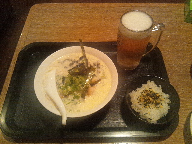 死に掛けながら土佐へ移動。 道中なんどか雨に降られる。 夕食はお気に入りの「土佐屋台餃子」を楽しみにしていたのだが、なんと「火曜定休」。 シオシオのパーである。 哭きながら夕刻の高知繁華街を歩いていると、とある「赤提灯」の店の看板Mが目に留まる。 高知名物「マヨネーズラーメン」 いや、噂には聞いていたが「マヨネーズラーメン」ってなんだんねん? そもそも、高知の名物って「鍋焼ラーメン」とちごたんか? 晩飯に「ラーメン」を食すのは、我が「食のポリシー」に反する(よぅな気がしないでもない)。 その誰に対するかよく判らない怒りに身を任せて入店し、思わず「マヨネーズラーメン」を注文。 しまった!? みすみす敵の罠に飛び込むとは… 「漢」と書いて「をとこ」と読む! 小さな御飯が付いて来たけど、取り敢えず夜なので「生ビール」頼んぢゃう。 で、食したったりましたわ。 一見 出汁が「ホワイトスープ」に見えるけど、これは「豚骨系スープ」に「マヨネーズ」を加味したものと思われる。 酢味が効いていて、食べる前に思っていたたよりひつこくない(関東弁で「しつこくない」の意)。 でもそもスープは最後の一滴まで呑み干すことは出来なかったゼ。 一時、なんでもマヨネーズを掛けて喜んで食べちゃうヒトのことを「マヨラー」と呼ぶ風習があった。 このラーメンも略して「マヨラー」なのだが、ふと思い出したことがある。 それは丁度「安室奈美恵」に最初のブームが起こった頃、彼女のファンも「アムラー」と呼ばれていた。 当時、勤めていた職場の同僚を集め「バンド活動」をしていた私は、やはりこの「ブーム」に便乗しない手はないと考えた。 そこでバンドメンバーを集め、下記の提案をおこなったのである。 「楽器奏者呼称を『安室奈美恵風』とするべし」 即ち ・ギタリスト → ギタラー ・ドラマー → ドラムラー ・キーボーダー → キーボーダラー(略して「棒鱈」) そのバンドで「ベース」を担当していた私の名称は 「ベスラー」だった… ってワシゃ銀色宇宙人に追われて地球へ来た「宇宙怪獣」かぁっ!? そりゃ「ベムラー」…