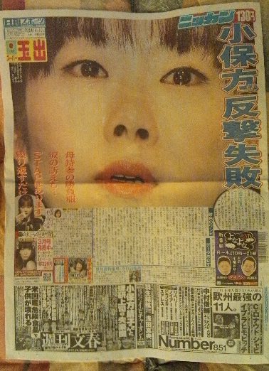 今日のマスコミは朝から「小保方さんフィーバー」。 あんなに「おぼかった」彼女が女性の最大の武器と言われる「涙」をも最大限に利用しての反撃に、「理研」も含め(男性?)社会はその行為に恐怖した。 しかも彼女の側に付くべき「女性陣」の一部が、彼女に対して壮絶な「拒否反応」を示したことも興味深い。 業務中のトイレ休憩にコンビニに立ち寄る。 厠を借りた手前、缶コーヒーか雑誌でも購入するかと店内を物色する。 すると「新聞紙売場」の方から、異様な視線を感じた。 『日刊スポーツ(ニッカン)』の第一面。「小保方晴子」女史の超巨大アップを飾る。 うわぁ、こりゃ怖いや。 「日記ネタ」的にも今後ナニかに利用できそうな気もして即購入130円。 いや、「日記ネタ」としてはいま現在充分に機能してくれたワケだけど、その他の「利用法」ってナニ? 『ビートクルセイダース』みたいに「お面」として活用する? 色っぽい上唇と下唇の間に丁度新聞の「折り目」が来ていることにも新聞社のあざとい「ドス黒い野望」すら感じてしまうのだ。 出た! 怪人『小保方仮面』 (やると思ったっしょ?)