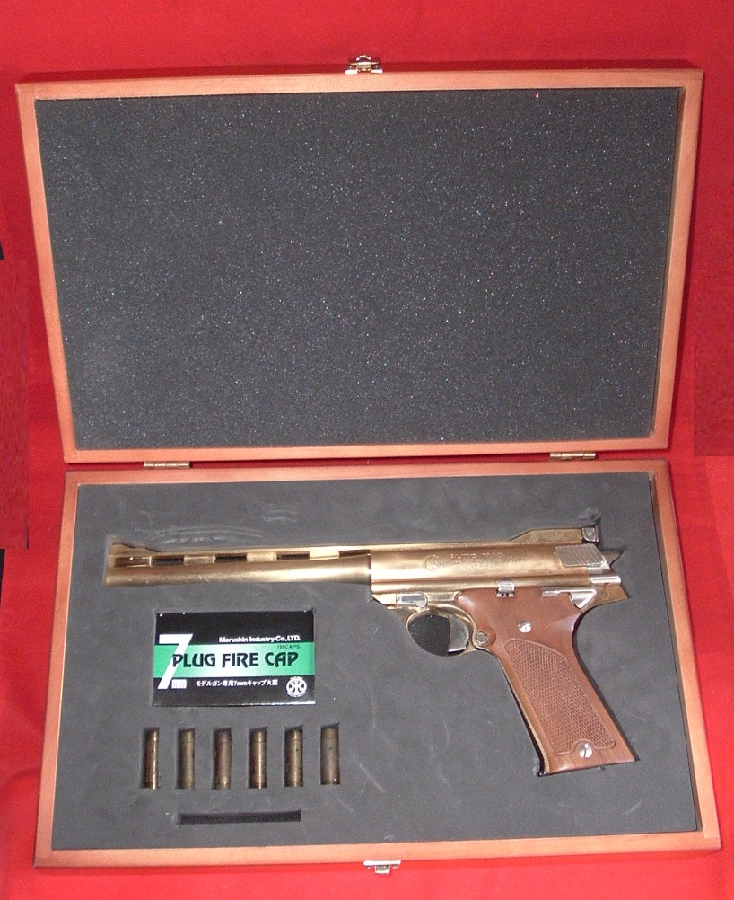 《HOLIDAY GUN-SMITH》 ついに手に入れました! 「マルシン社金属製モデルガン『44AUTOMAG"CLINT-1”』」 ふと立ち寄った趣味系中古店のガラスショーケース内にひっそりと、私が見つけるのを待っててくれたんですかねぇ。 初期型の木製ケース完備。 未発火(たぶん?)。 当時売られていた定価以下の「お得プライス」でした♪ 実銃の説明は不要なくらい有名な銃ですが『オートマグ(AutoMag)』とは1969年に発表、ハリー・サンフォードにより設計され1970年からオートマグ・コーポレーションによって一般発売された世界初のマグナム弾を使用する自動拳銃です。 そしてこの銃のモデルはAMT社が俳優クリント・イーストウッドに贈呈した銃身長8.5インチリブ付き銃身の特別モデル。 通常モデルではAxxxxxxとなっているシリアルナンバーには「CLINT-1(クリントワン)」の刻印があり、これが通り名になっている。 公式に生産されたのはこの一挺のみだが、試作品がアメリカ在住の日本人の手に渡っているんだって(なんと羨ますぃ)。映画『ダーティハリー4』において、クリント・イーストウッド演じる主人公のハリー・キャラハンが使用した物は、撮影用の模擬銃である「CLINT-2」であるとされている。 記念撮影は兄弟機種の「マルシン社ガスBLK『44AUTOMAG"CLINT-1”』」 銃の色はガスGUNの「銀色」が正解。(金属製モデルガンは黄色か白色、もしくは金色にしなくちゃ駄目だんですよ。法律的に) 銃本体のステンレス地金の色だが、真っ黒な「オートマグ」は日本のトイガンでしか存在しません。 「金属製モデルガン『44AUTOMAG』6.5インチモデル」の画像も挙げておきましょう。 こちらの刻印は「TDE」となっています。