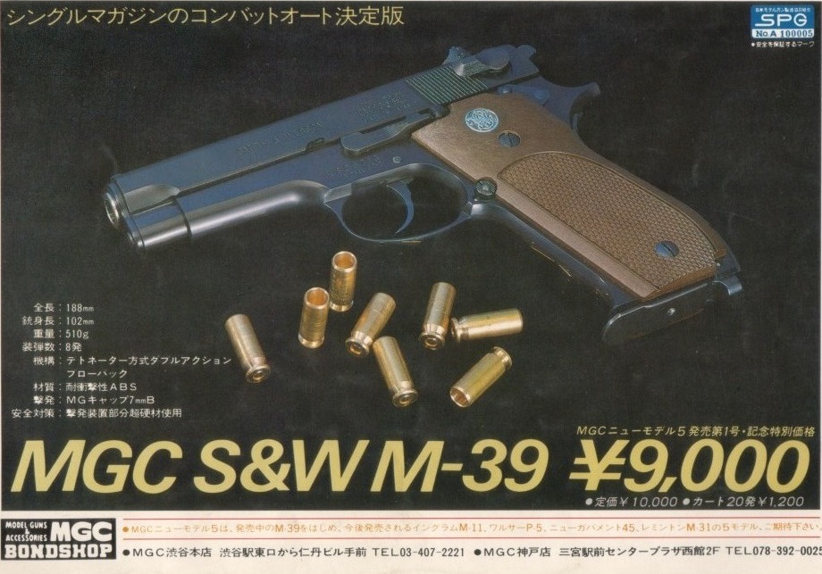 《SUNDAY GUN-SMITH》 今回はちょっと「穴埋め」的なネタで申し訳なす。 大分むかしに記録として撮っておいた画像を掘り起こしてまいりました。 「MGCモデルガン『S&W M-39』HW」でどや? 日本のモデルガン業界老舗「MGC」は金属製モデルガン時代に『S&W M44オート』という金属製モデルガンを発売していましたが、「モデルガン規制法」の影響で姿を消してしまいました。 その後10年立ち樹脂製モデルガンとしてMGCカスタム部門から発売されたのが『S&W M59』。 これは発売時に今は無き「MGC神戸店」に買いに行きました。 高価い「シルバーフレームモデル」だゼ!(当時18,000円もした!) 発泡スチロールの格好良い箱に入っていました。 ストレートBLKだったから、発火の調子が良いの何のって…滅茶苦茶調子よかったんですよ。 そしてMGCが創業20周年を迎えた1980年に「ニューモデル5」を発表し、その第一弾として発売されたのがシングルマガジン型の『S&W M-39』なのです。 発売当時は『M-59』のパーツをそのまま利用した部位も多く、スライドには「Smith & Wesson M59」のままの刻印で吃驚した覚えが。 今回ご紹介する『M-39HW(ヘビーウェイト)』は1983年8月中旬に発売されています。 上記のm59刻印は刻印自体がオミットされていて、少しガッカリ。 本体、マガジンのみで、中古購入価格6,000円くらい(だったと思ふ…覚えてねぇや)。 当時はマルシン社からもABS製モデルガン『M-39』が発売されており、そっちはリアルな「(疑似)ショートリコイルBLK(PFC)」だった。 けど「発火性能」はMGC(オープンカート)の方に軍配が上がった…ような気がする。 (後期のCP-HWカートは嫌い←音と火とか煙が少ないんだもの) PR