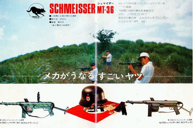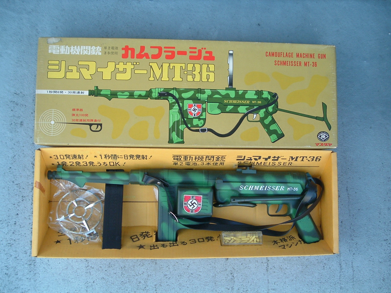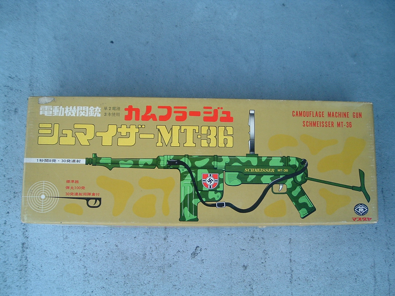 《HOLiDAY GUN-SMITH》でがす。 いやいや、「ガス」ぢゃないよ。 「電動GUN」です。 でも只の「電動GUN」やおまへん。 「元祖電動GUN」。 旧き懐かしき 「マスダヤ電動機関銃『シュマイザーMT-36』カムフラージュ(原文ママ)」 今を遡ること約35~40年以上前。 週刊少年漫画雑誌等に必ず掲載されていた「通販」のコーナー。 「ダダダ 1秒間に8発 出る出る30発!」という勇ましい惹句とともに、必ず載っていました。この「電動シュマイザー」。 欲しかったね。正直。 「もう中学生」だったけど… その時入手し損なった「怨念」をいま果たしたって感じ。 某ネットオークションで「デッドストック」を1K円で落札したワケだけど。(送料の方が高かった) この「カムフラージュ(迷彩:原文ママ)柄」の他に、真っ黒な「(リアル)ブラックver.」も有った。 ホントはそっちの方がカッコ良かったのだけど、「カモフラ」は云うならば「上位ver,」。 銀色鍍金に光り輝く大きな「(対空?)標準器」が付属している。 こげな大袈裟な「標準器」で狙われてもみたらアナタ、「グラマン戦闘機」も思わず昇天でっせ。 「マガジン(弾倉)」には、専用の蝿(蜂?)の卵みたいな「弾丸」が30発装填できる。 このマガジンを銃本体右側に垂直にセットする。 「シュマイザー」と名乗ってはいるものの、「ステンMk.Ⅱ」みたいな……。 銃本体の「マガジン風」な突起は、所謂「フォアグリップ」なのですな。 現代の「M4CARBIN」を彷彿させるアバンギャルド感です。ホンマカ? で本体に「単2電池×3本(別売)」をセットしたら射撃準備完了どす。 今ぢゃ「単2電池」って「電動シュマイザー」撃つ時と「目覚時計」くらいしか使わないんでないかい?(昔はラジカセにもよく使ったもんぢゃがのぅ…) ちなみにせっかく「デッドストック」を入手したのだから、電池入れたりして撃ちません! 実際に撃った経験のある人の記憶によると、2~3m飛んでヘナヘナと放物線を描いて落下するのがやっとという実力(ジツリキ)だったそうです。 メデタシメデタシ 記念撮影はアメリカ製「マテル社『TOMMY-BURST』」! コレは上記の「シュマイザー」より遥かに古い時代の産物(1960年台?)。 残念ながらマガジン前部のカバーが失われている。 ここに「玩具用巻玉火薬」をセットし、コッキングレバーを引きトリガーを引くと「連発」でバババ!と発火する。 スゴイ! MGCの初代「グリースガンM3」モデルガンくらい凄いゼ! でも火薬を使うと、すぐ内部機構がサビ錆になって稼動しなくなっちゃうのも凄い!! この『TOMMY-BURST』はK大SF研のmin(アクア)氏から譲ってもらった逸品。 でも我が幼少期、私はちゃんと持っていて発火させて遊んでたんだゼ♪ あとラジオの形から一瞬で「銃」になる玩具の持ってたなぁ…。 当時から「GUN少年」だったんだ。 |