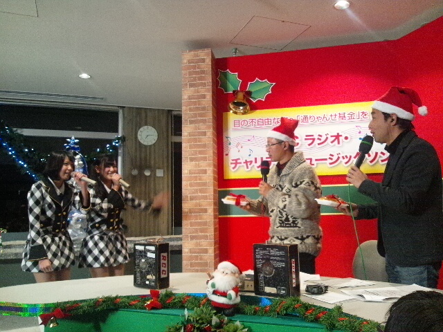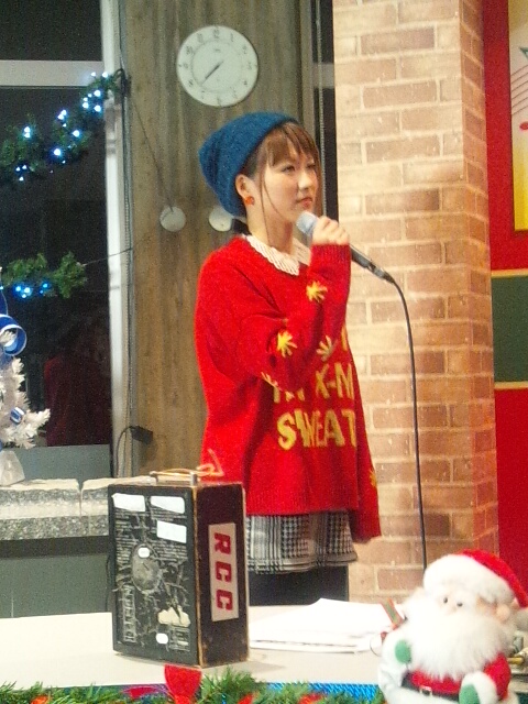 「中国地方」方面へ本年最終の納品と御挨拶ツアー。 各地で納品をしつつ「本年はお世話になりました。来年も宜しくお願いします」っちゅう感じ。 最終は広島地方へ。 以前(っちゅうても数年前だけど)入店したことのある「オードリー・ヘップバーン」のポスターや切抜きで壁面が飾られ覆われた女将一人でやりくりする「広島風お好み焼屋」で夕食。 この店の「広島風お好み焼」は「とろろ昆布」が隠し味で加えられており、それがアクセントとなって美味しい。 真っ暗な夜道を地元のラジオ局に向かって歩く。 クリスマスイヴの今宵は「ニッポン放送」ほかNRN系のAMラジオ局11局で同時に開催(放送)されている『ラジオ・チャリティー・ミュージックソン』の中国地域のキー局であり、現在の時刻では本社ビル の一階フロアにて「LIVE公開生放送」を行っているのを道中のラジオ放送で知ったのだ。 ラジオ局の入り口で幾ばくかの「募金」をし、すぐ目の前の「特設ステージ」に向かう。 あまり広くないフロアにステージが組まれ、折り畳み椅子が約50席。 その他は立ち見。 約80人くらいの老若男女が集まっている。 午後七時頃から運良く空いた一番前の「カブリツキ席」が確保することができ着席。 お隣は老夫婦。 奈良出身の「道盛浩アナウンサー」と「藤田弘之」氏のMCで、地元のローカルアイドル『フレンチトースト』のLIVEから観始める。 彼女達は日頃は広島東洋カープ公認グッズの販売員を行いながら、イベント等では広島のローカルアイドルとして活動している。 私の横に座っておられた「老夫婦」は髪の長い方の娘さんの「お祖父ちゃんお祖母ちゃん」だった! お祖父ちゃん一所懸命「孫娘」達の写真を撮っておられました。 ちなみに彼女達のオリジナルデビュー曲のタイトルは『恋の路面電車』! 「鉄」のヒトはググるが良い! やがてMCが有名アナウンサー「横山雄二」氏にバトンタッチ。 彼は今回のメイン司会者でもある。 ステージは「渕上里奈」嬢の登場。 彼女は、広島市を中心に活動する歌手、シンガーソングライター。広島を中心に活動するアイドルユニット「MMJ」のサブリーダーでもある。 たかが「地方アイドル」という冷やかし的な思いで彼女のステージを観たのだが、のびやかで耳触りの良い声と豊かな声量に腰を抜かす。 よくあんな細っこい身体で、迫力ある歌声が出せるものだ。 感動した。 ちょっと泣きそうになった。 色白の美人だし、これからの「注目株№1」としておこう。 引き続き『ヒッピー』という名の初めて観るミュージシャン。 コロコロ太ったヒゲ面のオッサンなんだけど、このステージが面白い楽しい♪ 目から鱗が落ちた。 素晴らしいエンタティナーで、またもや吃驚する。 めっさ楽しかったゼィ。 この『ヒッピー』と『渕上里奈』は「横山雄二」が監督し来春に放送されるTV映画『浮気なストリッパー』にも出演されるとのこと。 その「横山雄二」がロックバンド「LORAN」のヴォーカル「YASS」と組んだ『ヨコヤマとヤスシ』のステージ(YASSのソロボーカルだけで時間が無くなっちゃったけど)を最後に観て、ラジオ局を後にする。 なんか楽しい有意義な「くりすますイヴ」が過ごせて良かったゼ♪ いやぁ、LIVEは素晴らしい♪