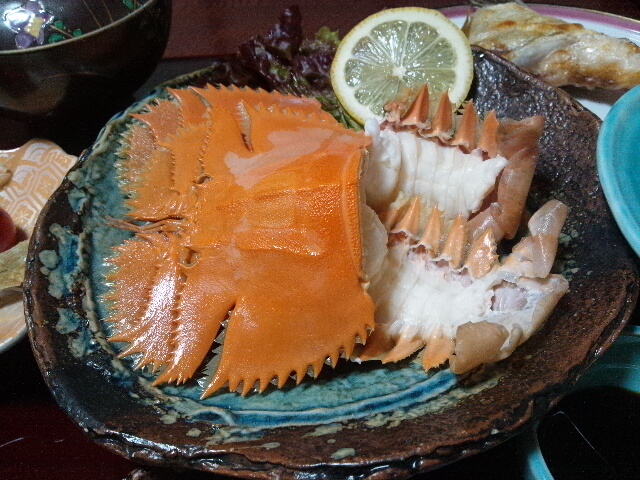 魔都廣嶋で目覚める。 夜から朝にかけては寒い。 ところが昼間はそれなりに30℃超えちゃったりするので始末に負えない。 広島市内から大竹市へ。 その後、山口県岩国市をかすめて北上。 島根県へ至る。 夕刻、島根県益田市の定宿「かじか荘」へチェックイン。 温泉で旅の汗と埃を洗い流したあとは、お楽しみの夕食でごんす。 今年、この宿は「創業百周年」を迎える。 そこで前回に「百周年記念20%割引券」を頂いた。 今回の宿泊にあたり、予約時に厚かましくも「この割引券を使用させてもらいますので、食事はいつもよりも豪華にしてちょんまげ!」と声高らかに宣言していたのだ。 嗚呼、楽しみ楽しみ。 女将自ら運んで呉れた晩餐は、それはそれは想像以上に豪華版! メインは『団扇海老(ウチワエビ)』に二年ぶりに御目通り。 見た目は「宇宙生物」っぽいけど その身は美味い旨い♪(量が少ないのがちょっと残念) 二尾を喰い尽くして御機嫌で居ると、更に女将が二尾サービスしてくれた。 有難い。 そこで 「でゅわっ!」 っと『ビラ星人仮面』、もしくはプロレスの星『アステカイザー』に変身してみました! って、このネタ、二年前にもやってた記憶が…