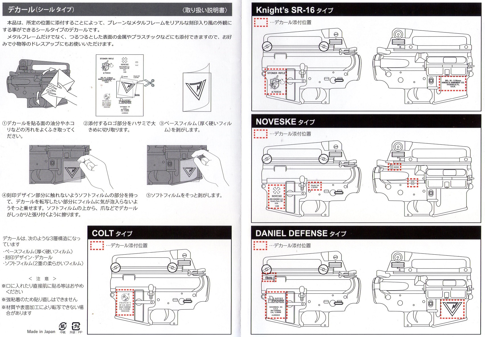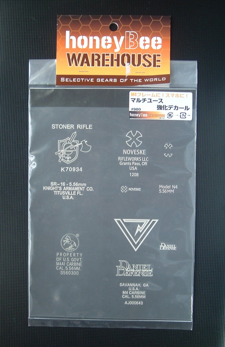 正解は「ノヴェスキー」だってw だって「のべすけ」の方が親近感があってイイんでないかい? 「呑んだくれの助平」みたいで… 《SUNDAY GUN-SMITH》 『今日のM4 CARBIN GBB』♪ さて昨年末入手した『KJworks M4 CQB GBB』 ですが、フレームが無刻印なのを残念に思っていたのは以前に記述したとおり。 まぁるで「国籍不明GUN」で、某国特殊部隊御用達と言い切る手もあったのですが、やはり何処か寂すい。 そこでこんなモノを入手いたしました。 「honeyBee WAREHOUSE製『マルチユース強化デカール』 無刻印「M4/M16シリーズ」のフレームドレスアップ用の「圧着転写式の強化デカール」。 ・Knight’s Armament(ナイツ・アーマメント) ・Daniel Defense(ダニエル・ディフェンス) ・Noveske(ノヴェスキー) ・Colt Firearms(コルト・ファイヤーアームズ) と有名どころをしっかり押さえている。 また、ガンのフレームに限らず、携帯電話やスマートフォンなどにもオススメとも惹句にある。 使い方は簡単。 シールの周辺を適度なサイズに大まかにカットして、本体フレーム等平坦部に乗せ指先などで擦る。 昔々に「ガム」に付いていた「シール」と同じ手順だね。 懐かしや。 「強化デカール」を名乗るだけあって、かなりシッカリ転写できる。 今回の「KJ M4」には「Knight’s Armament」を選んだ。 プリント色の白色はもっとロービジ(低視認性)の灰色グレーでも良かったんぢゃないかな? でもまぁ「KJ M4」の「名無しの権兵衛」状態を脱することが出来て、一安心。 余ったデカールの部位も、後で色々と使えそうだ。 しまった! って後から気が付いたのだけど、もう一挺の「WA M4」に後付けしたメタルフレームが『KNIGHTsARMAMENT co.米国海兵隊刻印』ですた… よし! 知らんぷりしようっと♪ ちなみに(←我が拙日記ではお馴染みのフレーズだね) 先日「MAGPUL PTS『MOE ハンドガード』を格安で入手したので「WA M4」に移植しました。 これって今まで「不細工なハンドガードやなぁ…」って思っていたけど、実際に装着してみると流石「人間工学」のい基いたデザイン! 滅茶苦茶「握り心地」が良いんンです。 一発で惚れてしまいました。「MOE(萌え)」なだけに… 一応「MOEバーティカルグリップ」も入手したんだけど、やっぱ「ハンドガード」の握り心地には敵わないから使用してません。 それに伴い付いていた『MAGPUL PTS ACS Carbin Stock』を「KJ M4」の『MOEストック」と交換。 同時に「マグウェルグリップ」なども全部「KJ」に取り付けて「WA M4」の軽量化を図りました。 いままでの二挺の個性を180°方向転換した感じですね。 PR