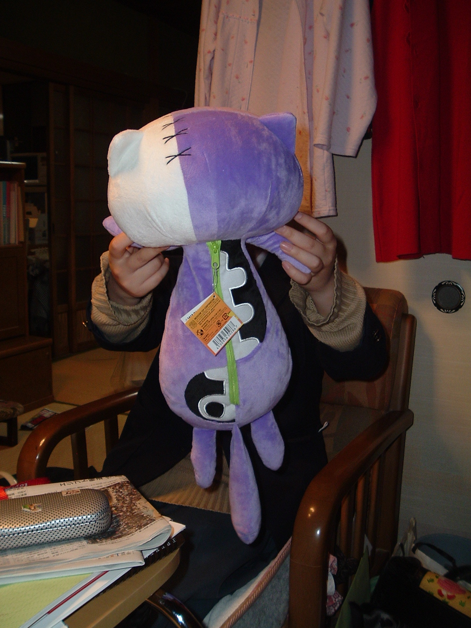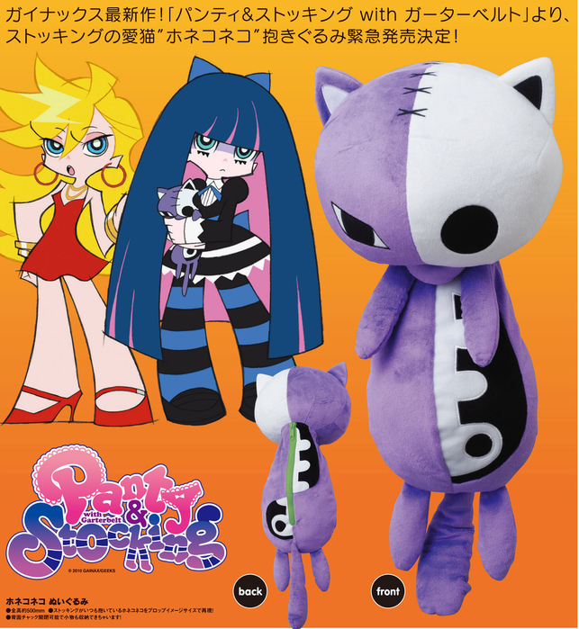 【2月13日の「天地の狭間に惑いし子らより産まれし邪悪な精霊よ。 聖なる処女の柔肌に纏いし衣の雷で、穢れも濁りも淀みもしこりも 微塵に砕いて天地に還す。 悔い改めよ!」日記】 さて中身はGAINAX制作アニメ『パンティ&ストッキングwithガーターベルト』より、主人公の二人の女の子(天使)の一人(妹)ブルネットの巨乳ゴスっ娘「ストッキング」嬢のいつも抱いている『ホネコネコ』のぬいぐるみであります。 で、この「死んで半分白骨化した子猫のヌイグルミ」だが(身も蓋もない記述)、流石「メディコムトイ」が制作しただけあって良く出来ている。 現在一部のネット上で「EDの解釈」について議論沸騰中のこの作ですが(http://michaelsan.livedoor.biz/archives/51494661.html)、